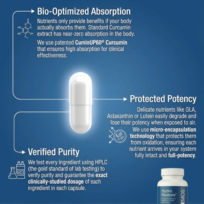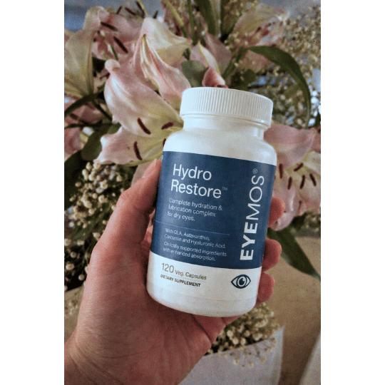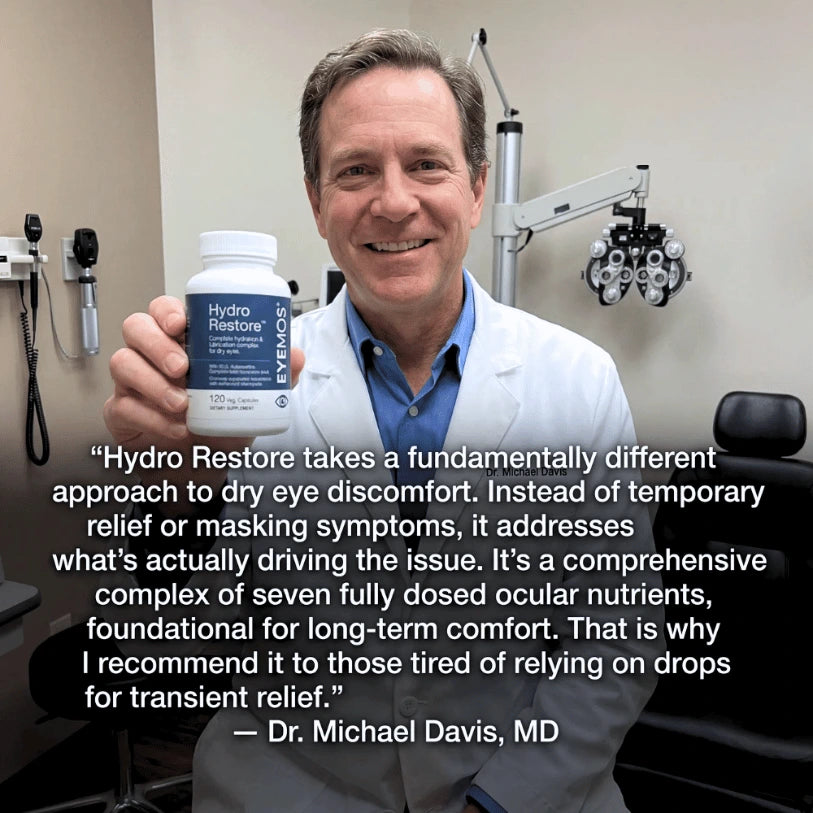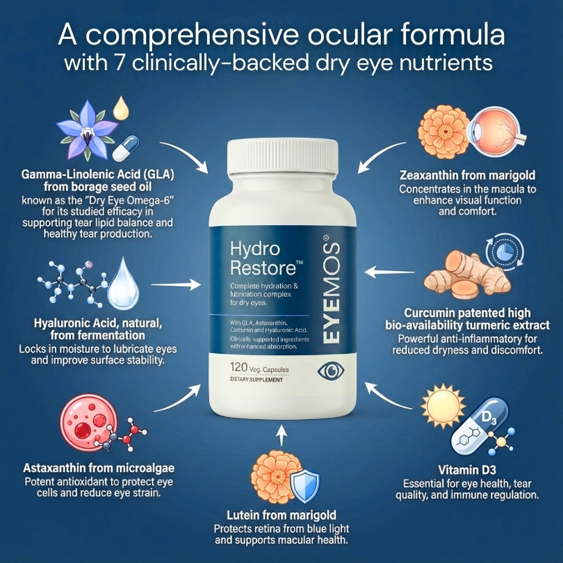 Hydro Restore is a complete daily complex of 7 fully-dosed ocular nutrients that target the actual drivers of dry eye discomfort.