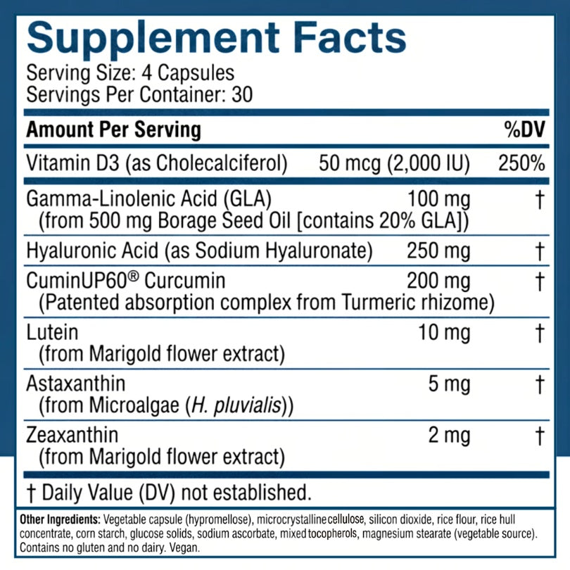 From Borage seed oil—the most potent natural source—GLA is an omega fatty acid called the "Dry Eye Omega" for its studied efficacy. Gamma-Linolenic Acid supports the healthy oil layer of the tear film—the key piece for combating dryness. - Hyaluronic Acid (Sodium Hyaluronate) — 250 mg