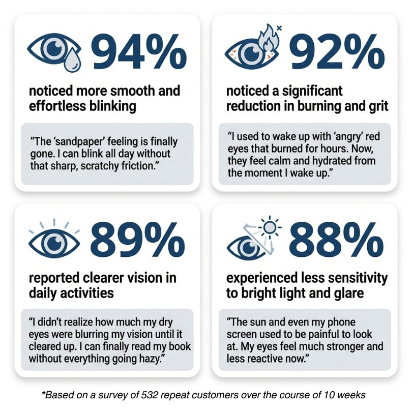 By providing your eyes with their essential daily nourishment, you can expect a return to natural, continuous comfort. The most common “wins” customers experience include: